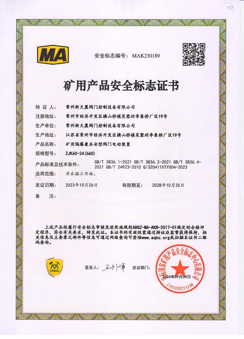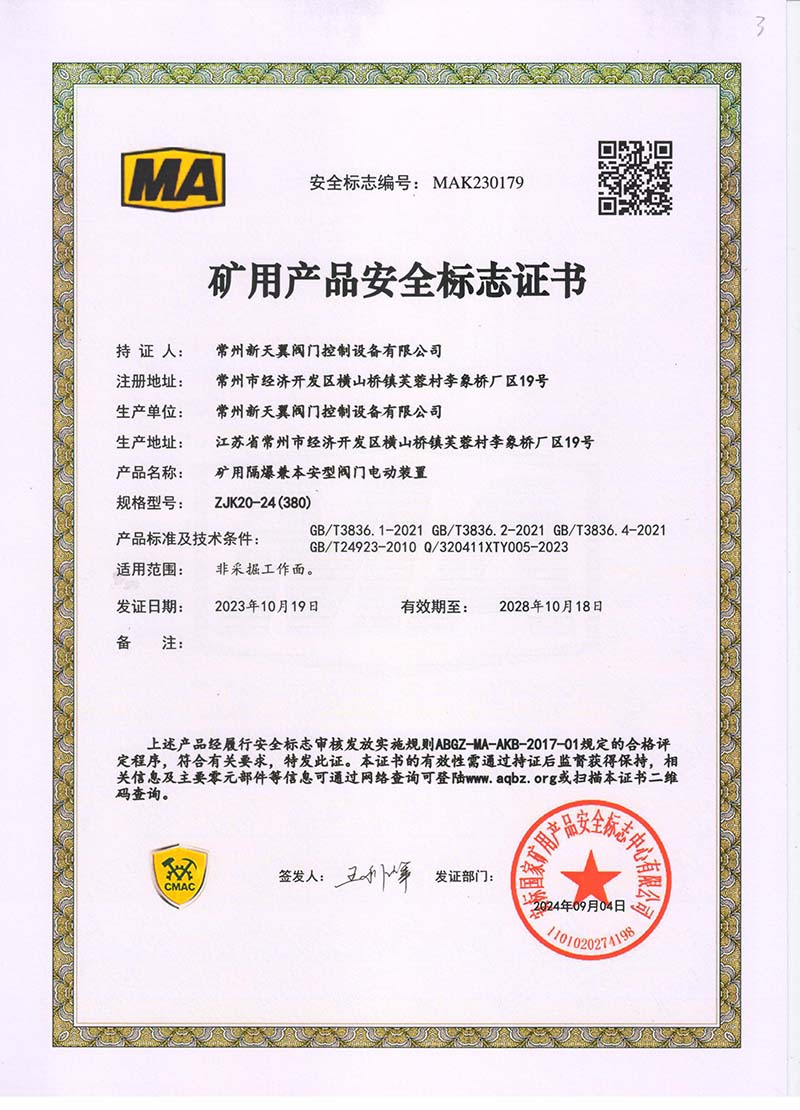 礦用產品安全標志證書ZJK180-24(380)